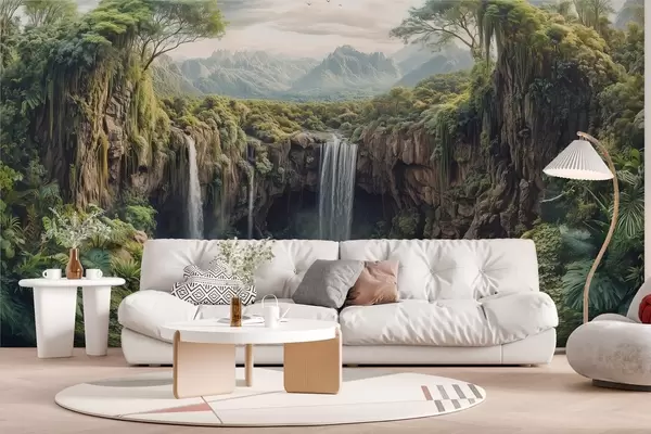 Fotomurales gran panorámica del cañón con árboles y una cascada Nr. w02294