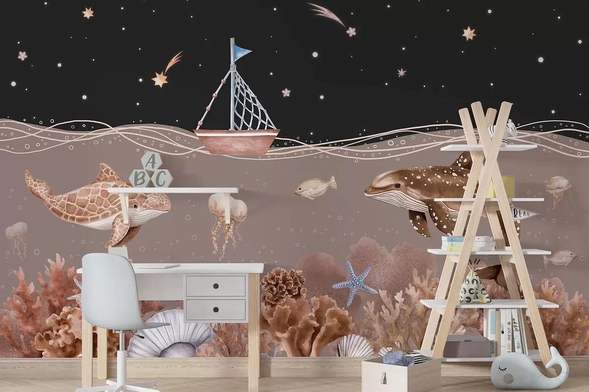 Fotomurales Vida marina, estilo acuarela, corales, barco, delfín, medusa, cielo nocturno estrellado, colores beige Nr. w02310v1