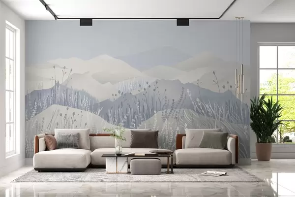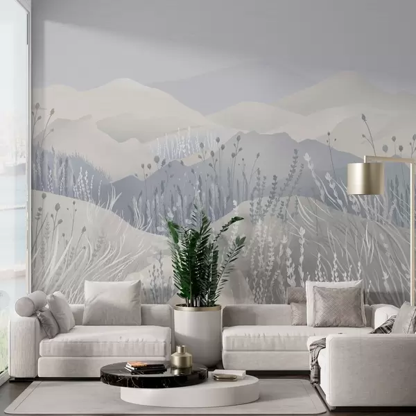 Fotomurales Montañas neblinosas y campos de hierba y flores en tonos azules Nr. w02317v1