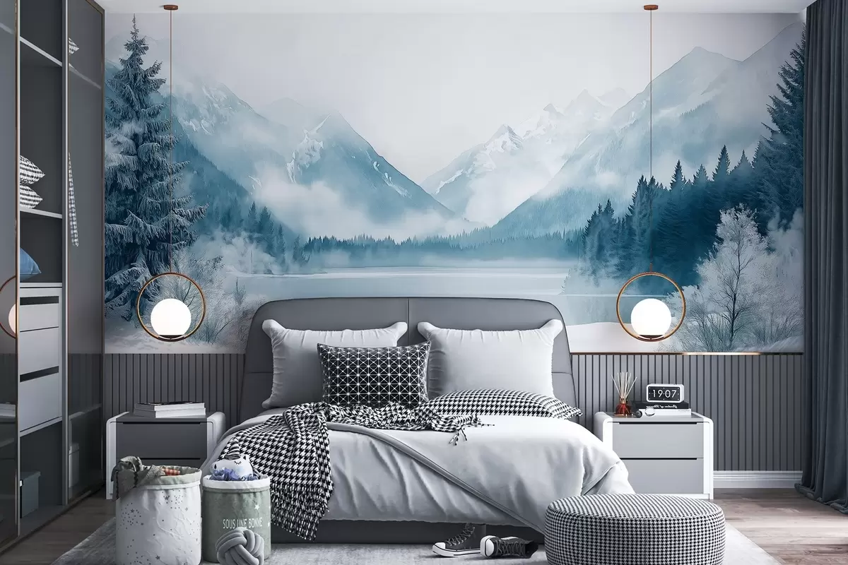 Fotomurales Montañas invernales, lago helado, bosque de pinos, paleta de colores azules, estilo acuarela Nr. w02354