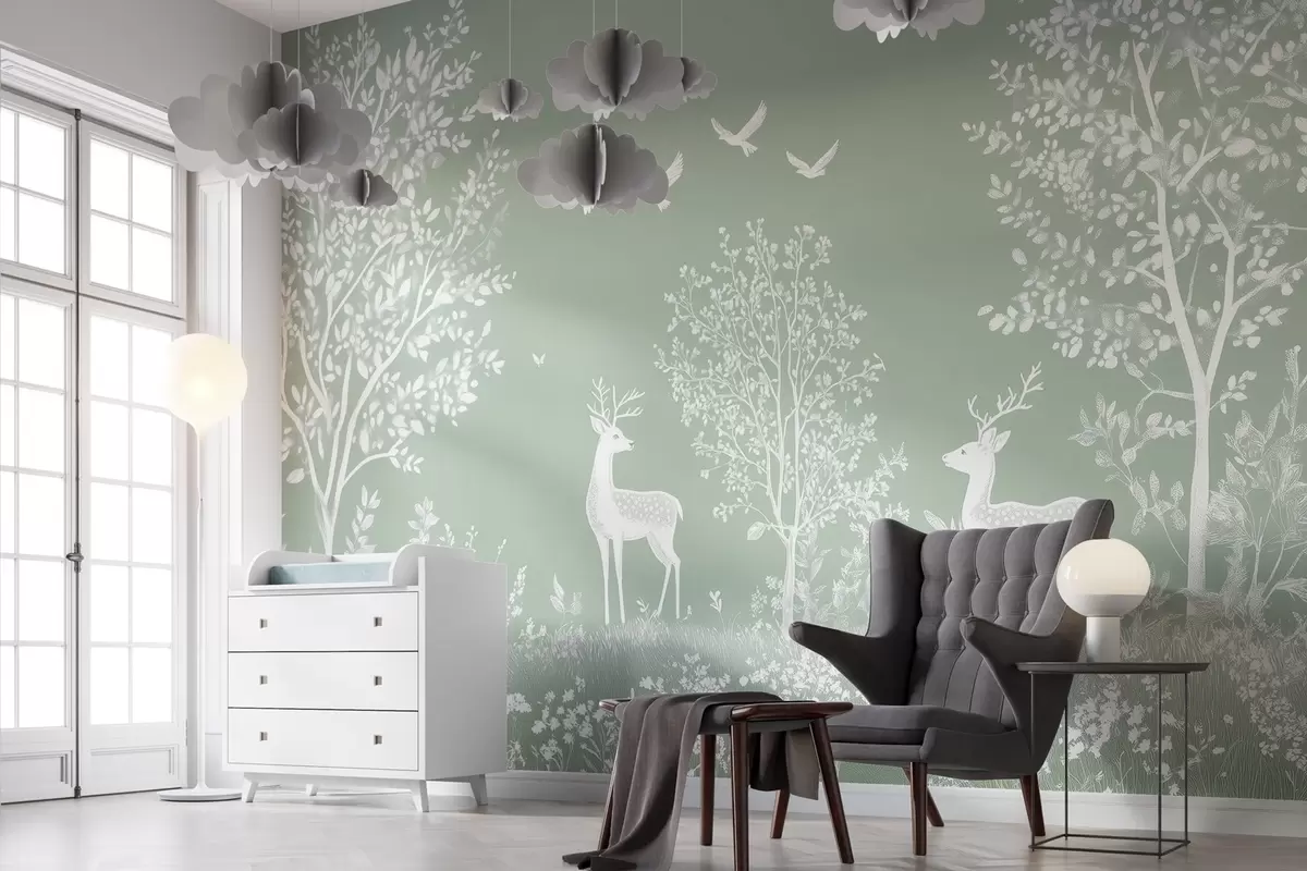 Fotomurales bosque con ciervos en el estilo de un dibujo a la tiza sobre un fondo verde Nr. w02444