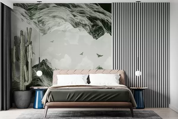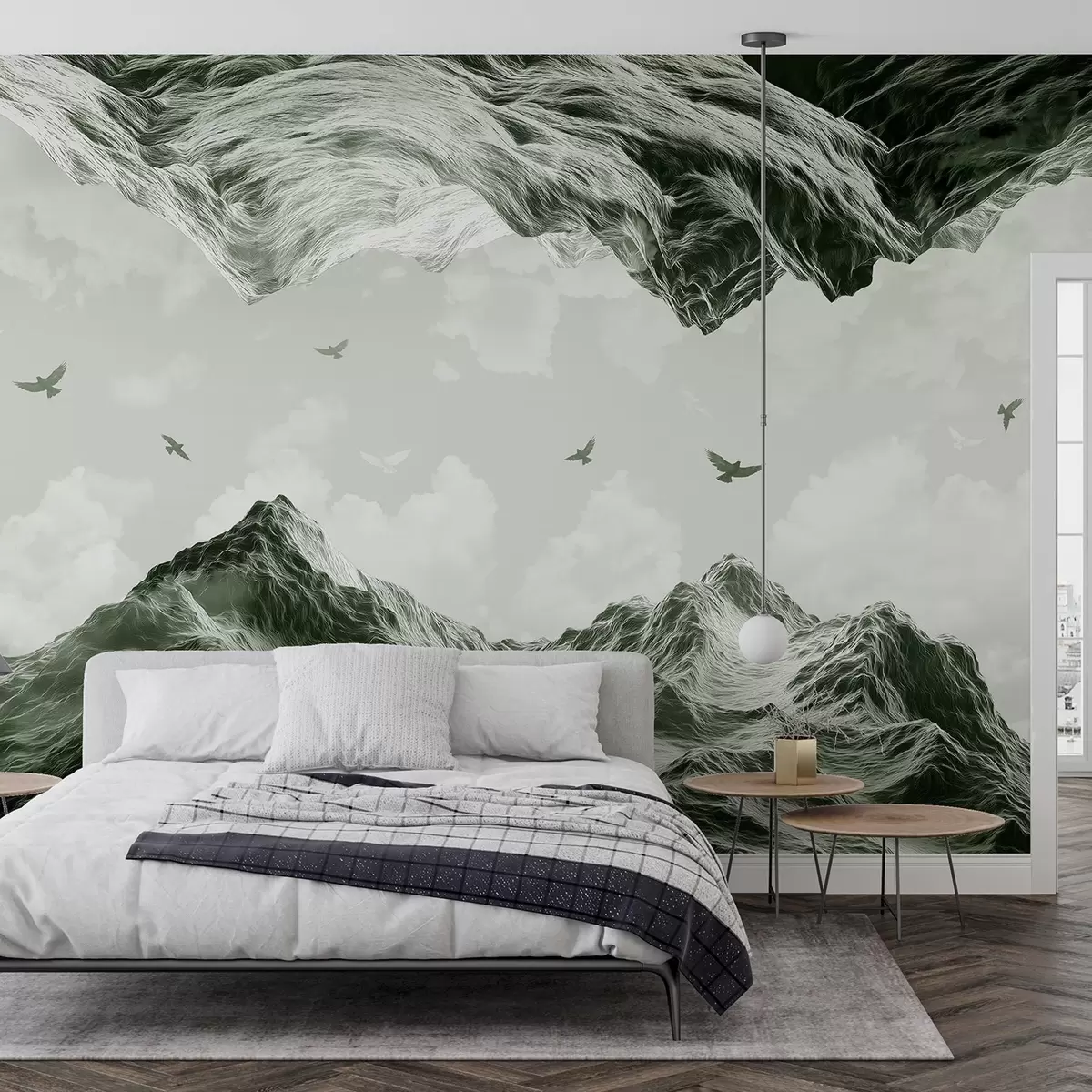 Fotomurales Paisaje de montaña, realismo, pájaros volando, naturaleza, nubes, colores verdes Nr. w02514v3