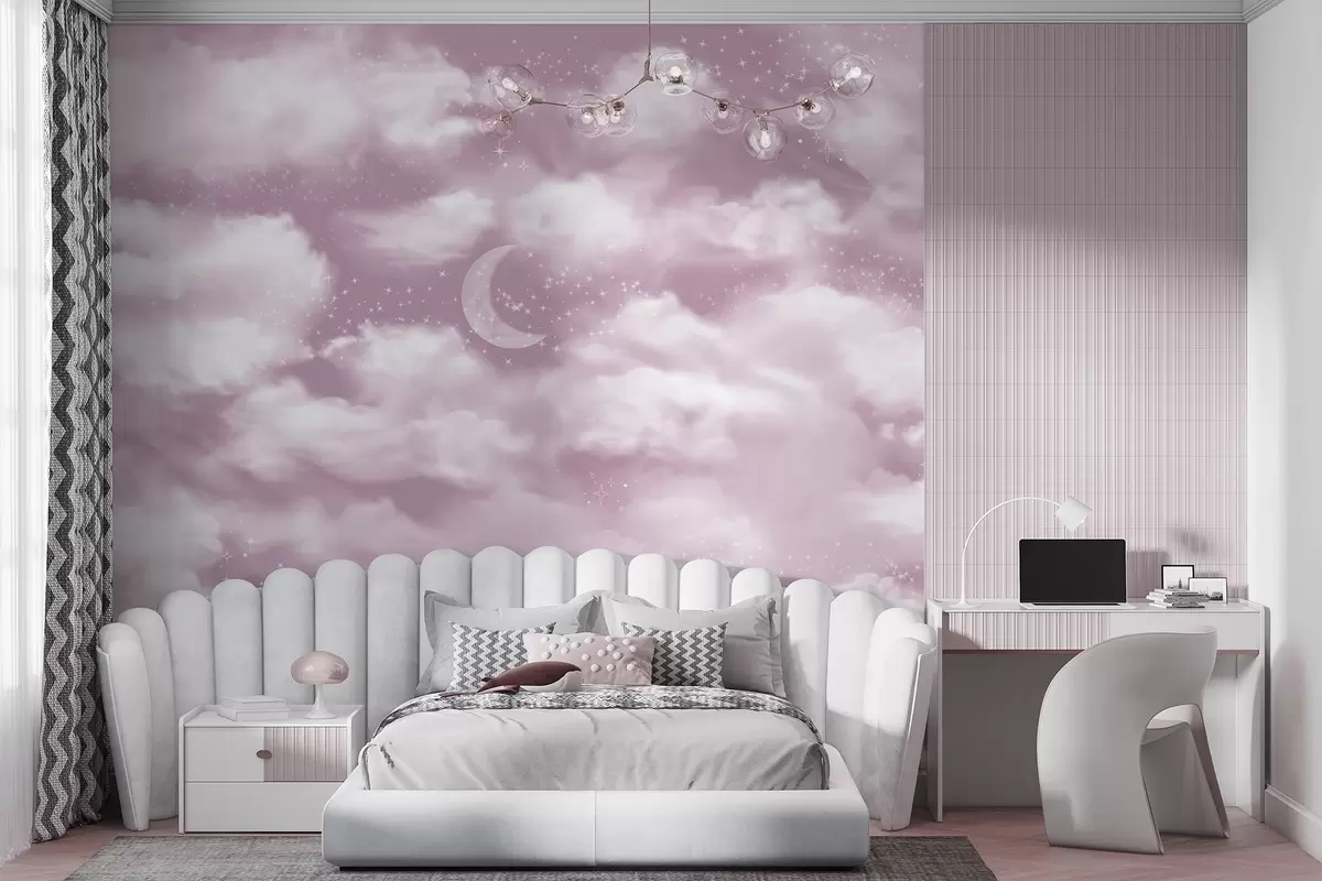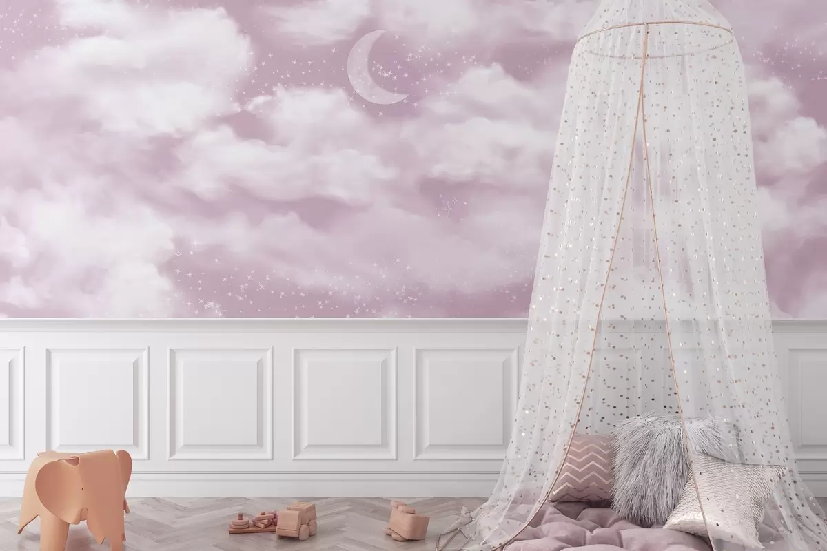 Fotomurales Cielo estrellado con luna y nubes, de ensueño, etéreo, colores rosa suave Nr. w02515v3