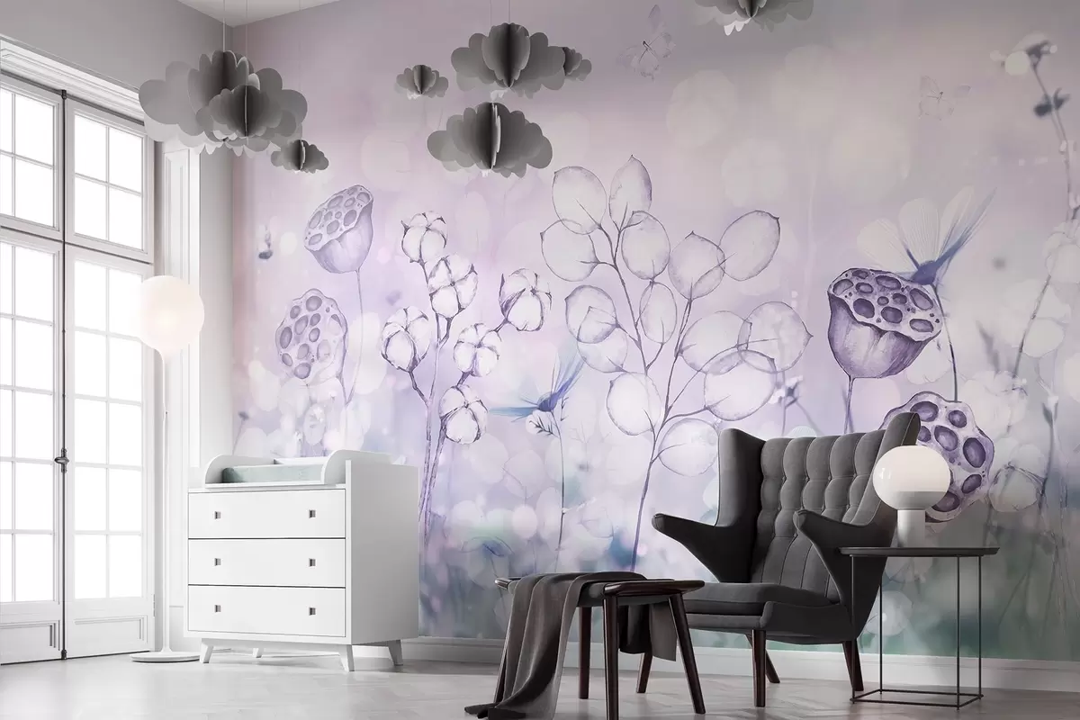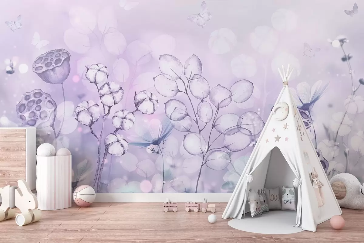 Fotomurales Jardín de flores de ensueño, mariposa, flores de algodón, lotos, colores morados Nr. w02516v1