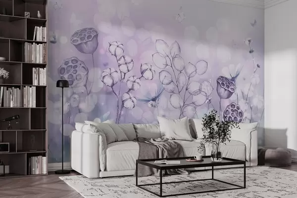 Fotomurales Jardín de flores de ensueño, mariposa, flores de algodón, lotos, colores morados Nr. w02516v1