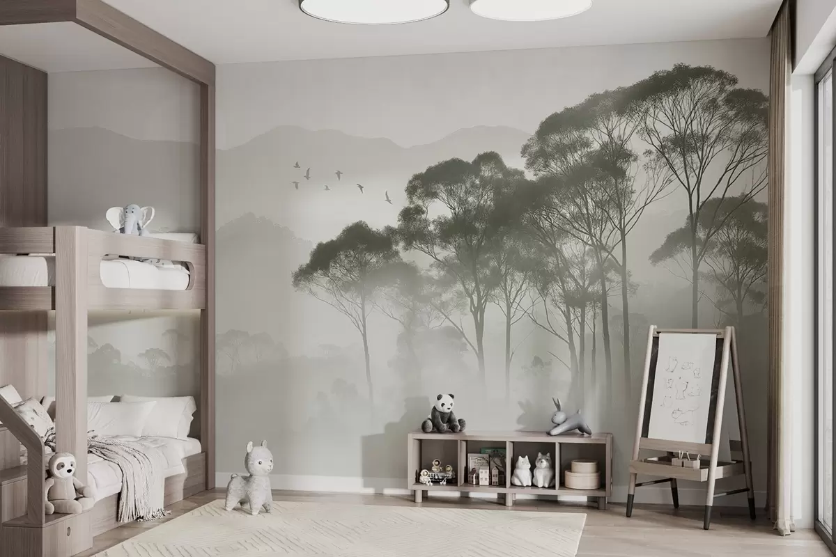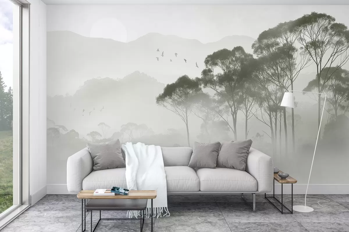 Fotomurales Árboles en la niebla, paisajes de naturaleza, pájaros, sol, colores verdes Nr. w02740