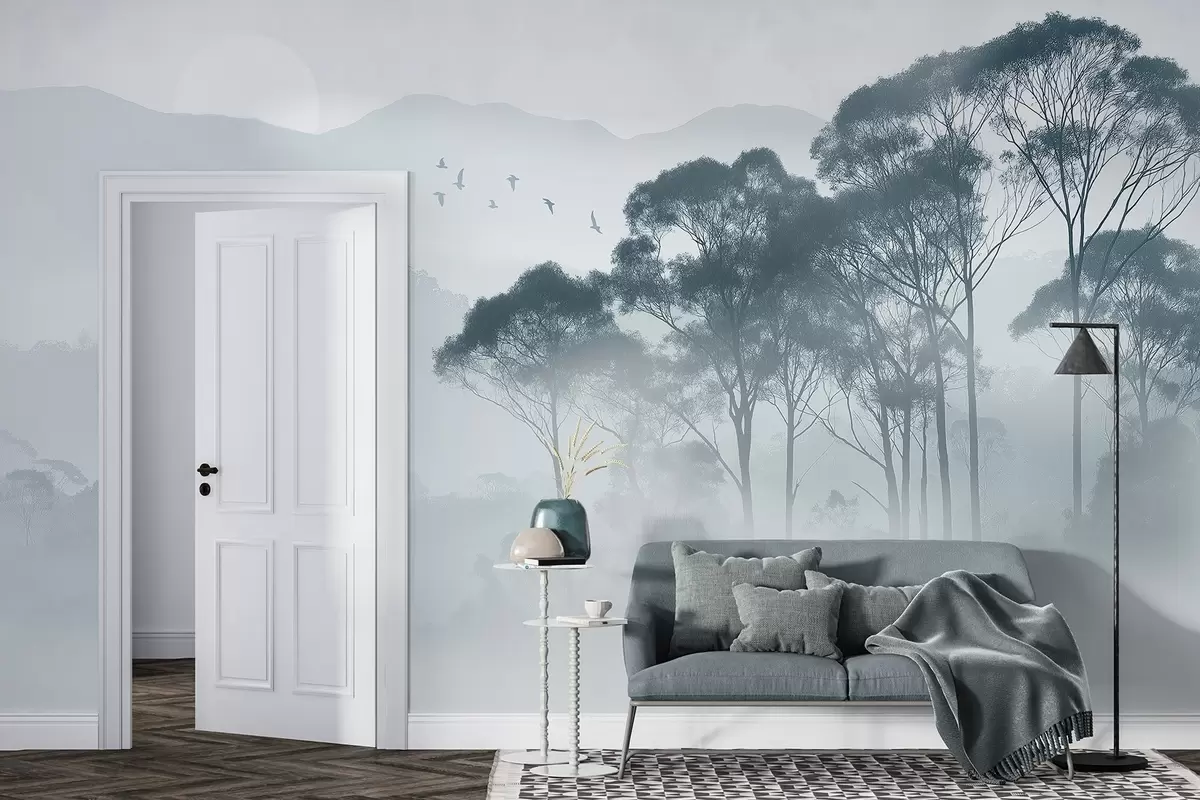 Fotomurales Árboles en la niebla, paisajes de naturaleza, pájaros, sol, colores azules Nr. w02740v1