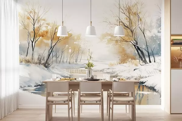 Fotomurales Paisaje invernal de río con bosque, dibujo estilo acuarela Nr. w02743
