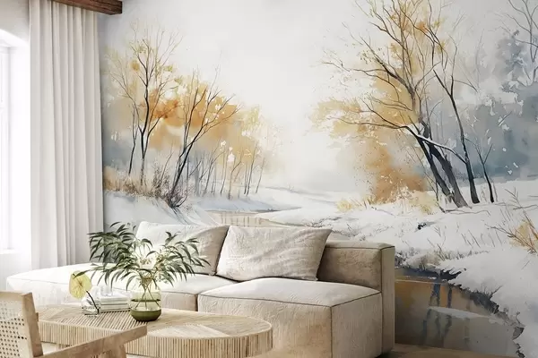 Fotomurales Paisaje invernal de río con bosque, dibujo estilo acuarela Nr. w02743