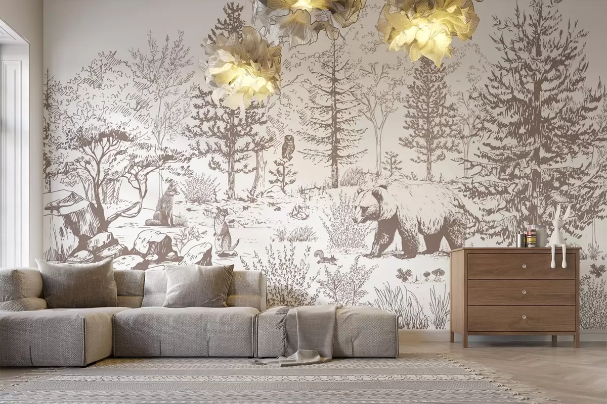 Fotomurales Vida en el bosque, árboles, animales salvajes, oso, zorro, búho, arbustos, dibujo a lápiz, colores beige Nr. w02929
