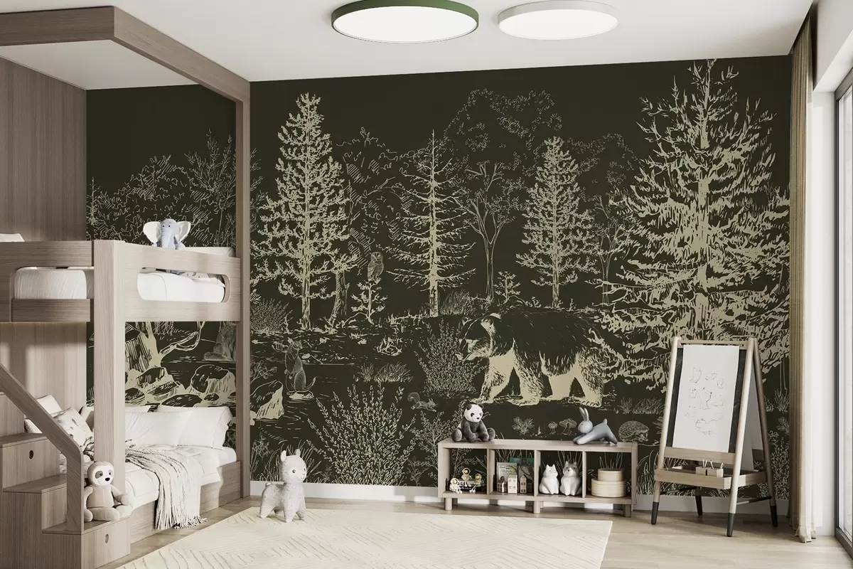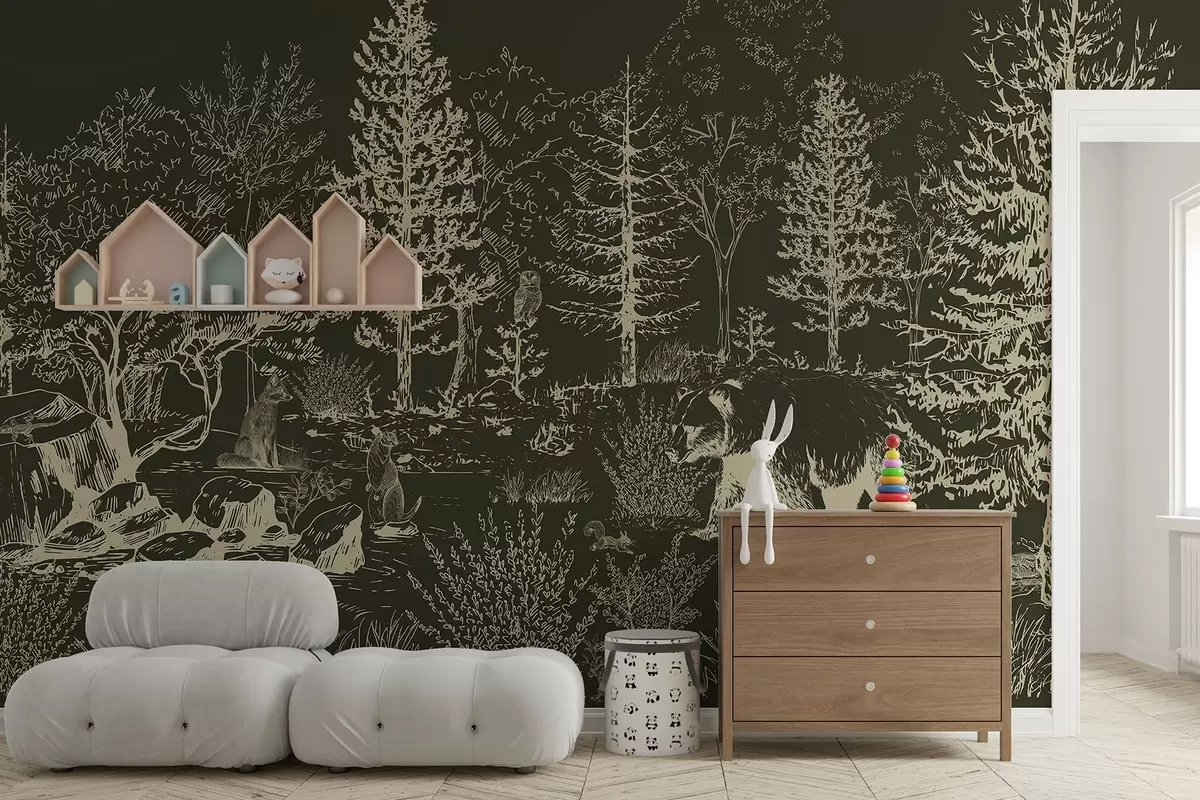 Fotomurales Vida en el bosque, árboles, animales salvajes, oso, zorro, búho, arbustos, fondo verde oscuro Nr. w02929v3