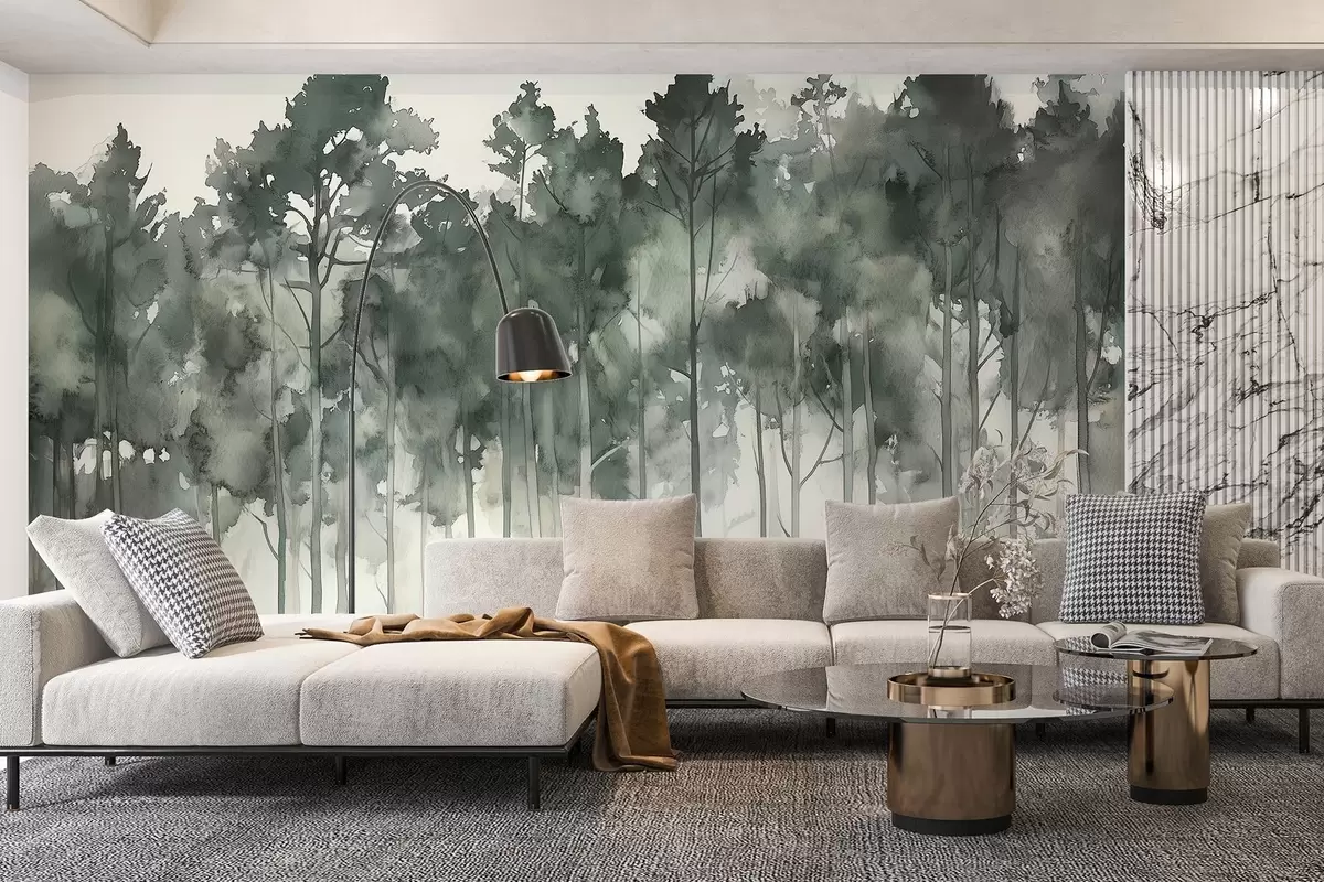 Fotomurales Bosque estilo acuarela, pinos, paisaje natural, colores verdes Nr. w02937