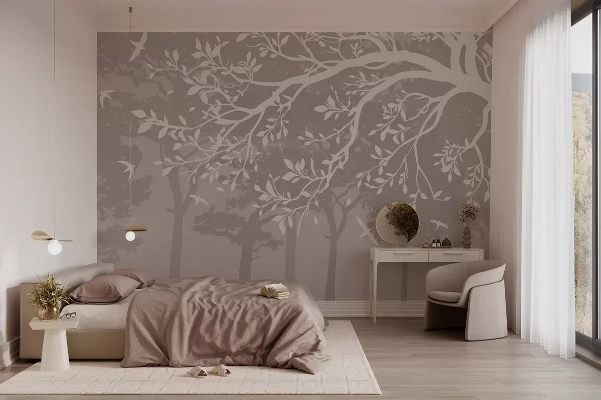 Fotomurales silueta de una rama de árbol cremosa con pájaros, sobre el fondo del bosque Nr. w03116