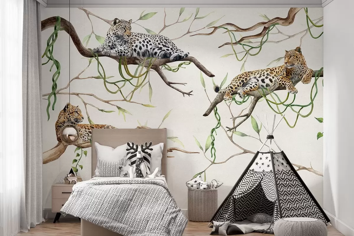 Fotomurales Leopardos en los árboles de la selva, lianas, tropical, animales salvajes, paleta de colores naturales Nr. w03146