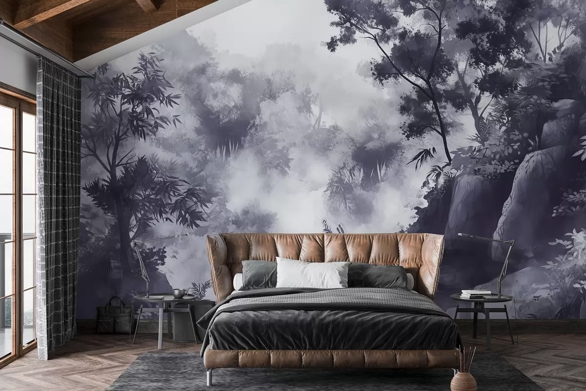 Fotomurales Paisaje oriental, selva, árboles, estilo acuarela, colores grises Nr. w03149v1