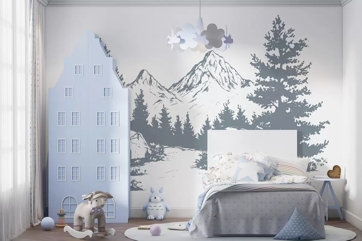 Fotomurales Los Alpes, montañas con bosque, dibujo lineal, color gris Nr. w03342v2