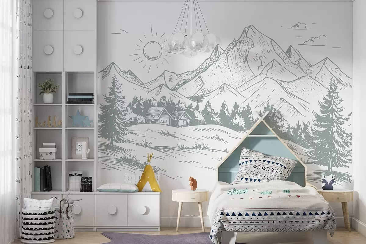 Fotomurales Dibujo de montañas, paisajes naturales, bosque, casas de madera, color menta Nr. w03347v1