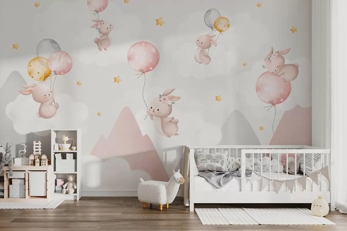 Fotomurales Conejitos con globos sobre nubes entre picos montañosos Nr. w03375