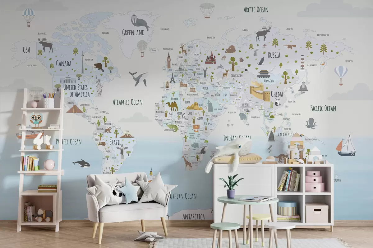 Fotomurales Mapamundi con animales y puntos de referencia Nr. w03410