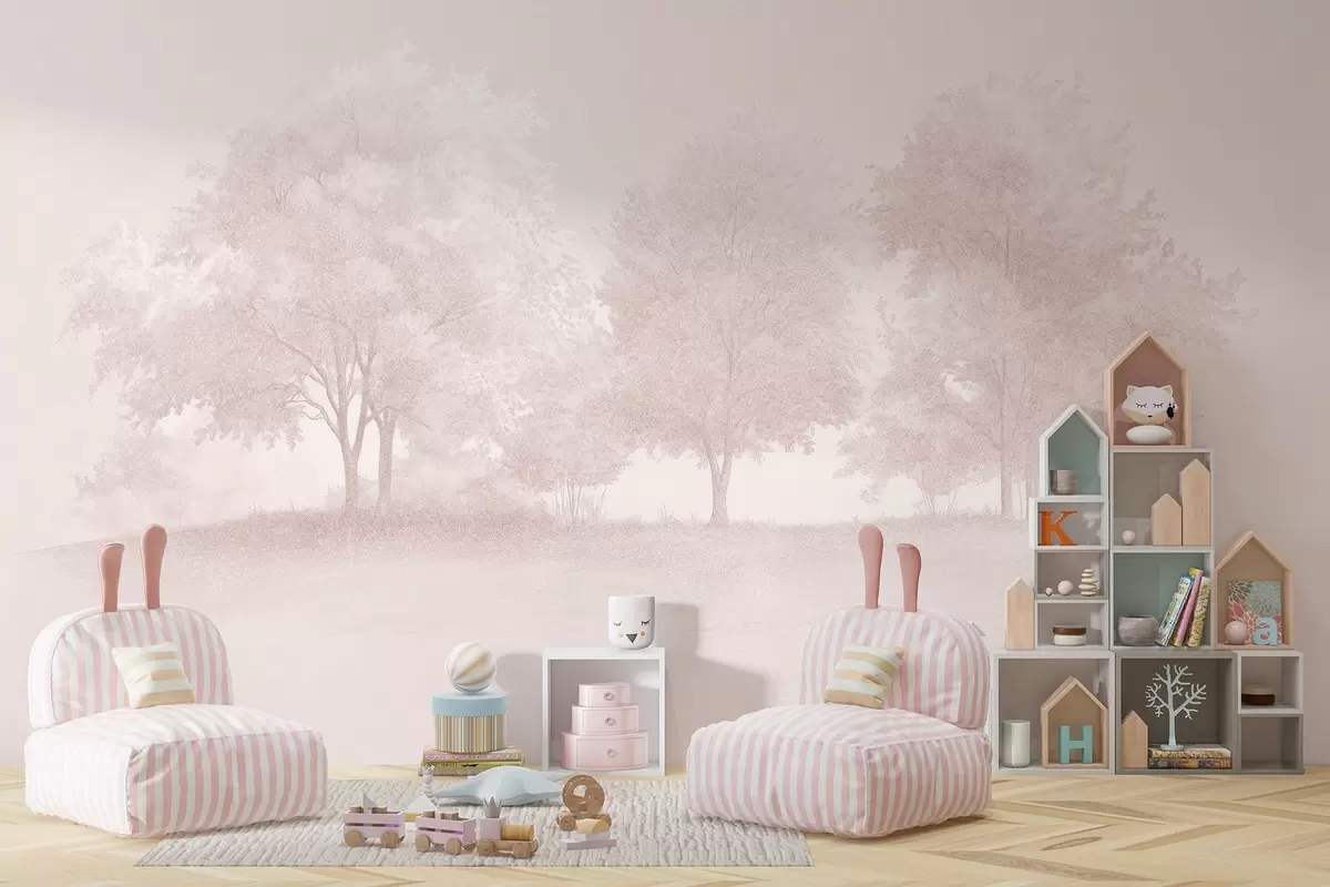 Fotomurales Árboles en flor, primavera, dibujo a lápiz, colores rosas, naturaleza Nr. w03549