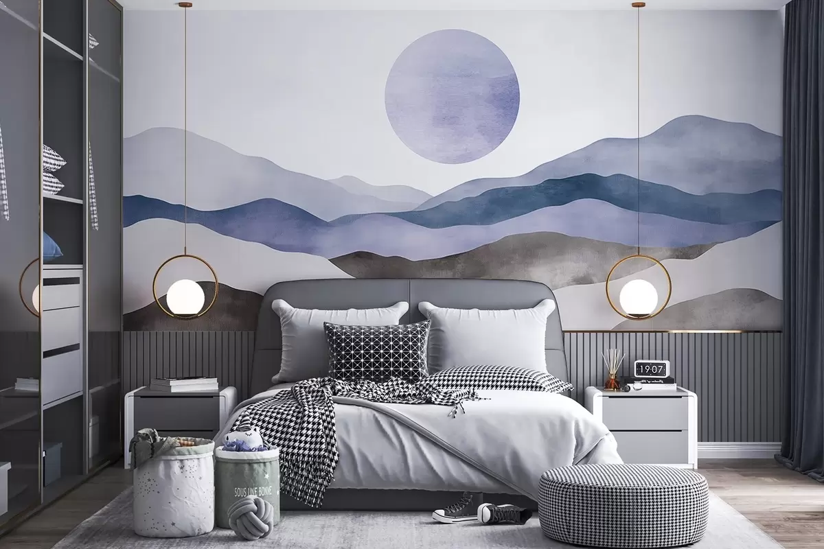 Fotomurales Acuarela montañas con el sol, estilo boho, púrpura, azul, gris Nr. w03551v1