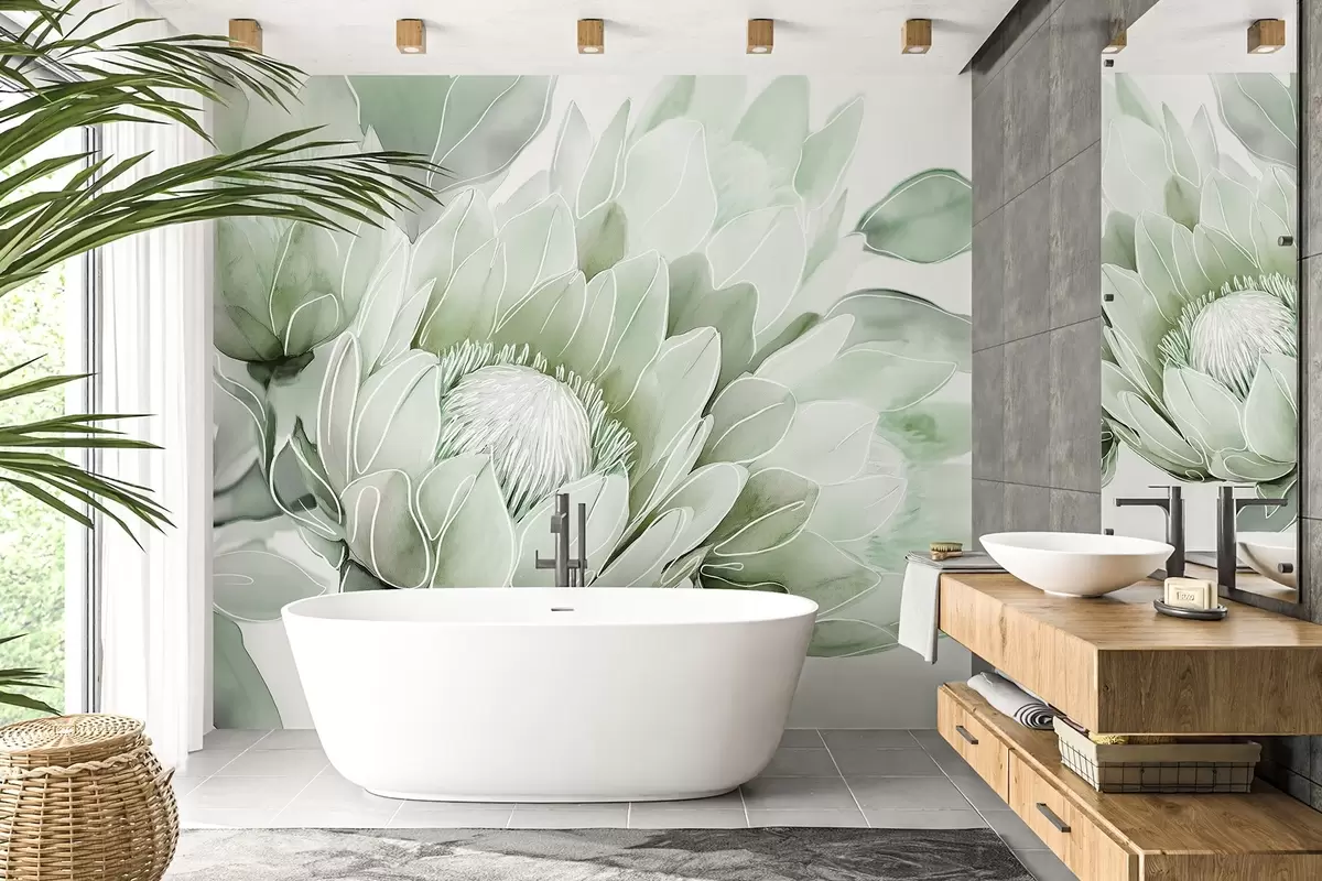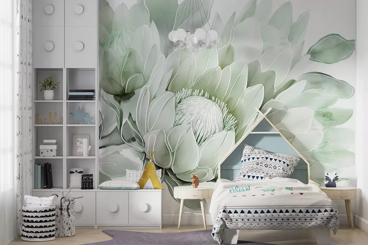 Fotomurales Hermosas flores de protea, dibujo lineal, tropical, colores verdes Nr. w03669v2