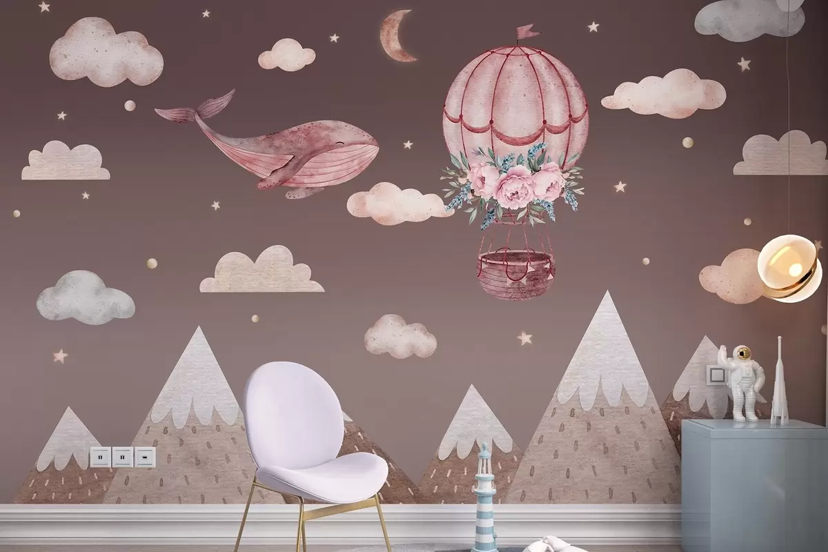 Fotomurales Ballena linda con globo de aire, cielo oscuro con nubes, montañas, acuarela, colores rosados Nr. w03673v1