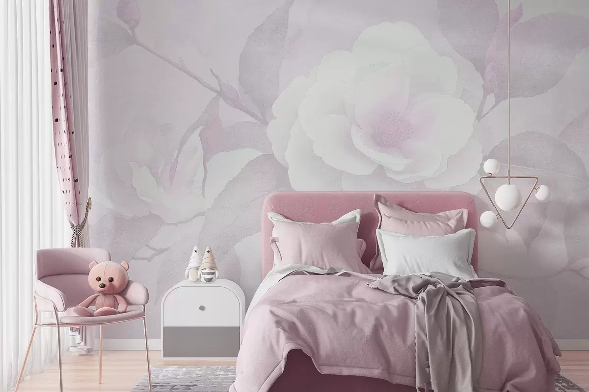 Fotomurales Pastel suave con flores de camelia en la rama, colores rosados Nr. w03760v2