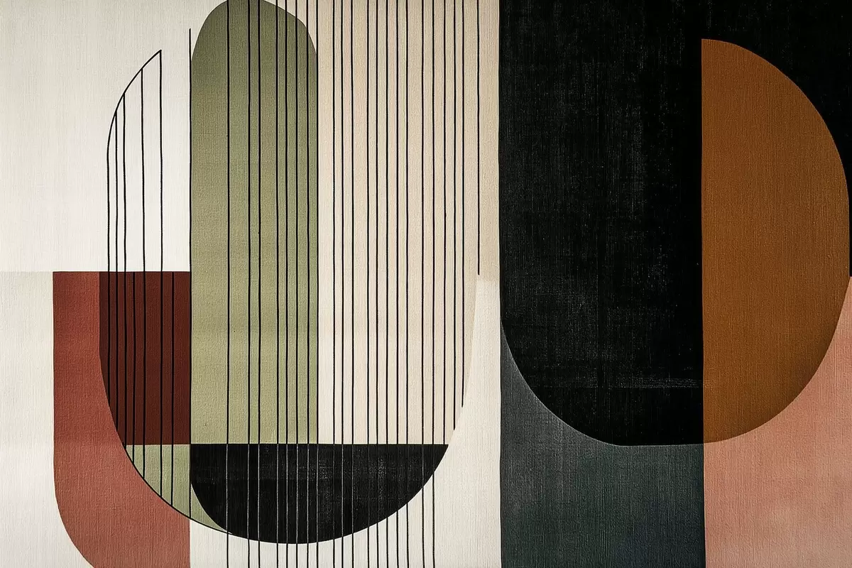 Fotomurales moderna composición geométrica abstracta con formas superpuestas y patrones de líneas verticales, finas líneas que rellenan trapecios y óvalos, suave textura textil superpuesta, tonos cálidos apagados como verde oliva, topo, beige y carbón, sutiles efectos de transparencia entre las formas Nr. w03937v4