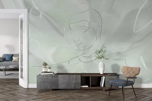 Fotomurales Abstracción floral con dibujo lineal de Buda, colores verdes Nr. w04004v3