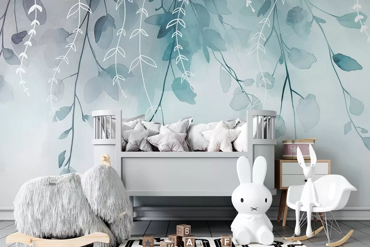 Fotomurales Ramas con hojas en estilo acuarela, colores aguamarina naturales Nr. w04007v3