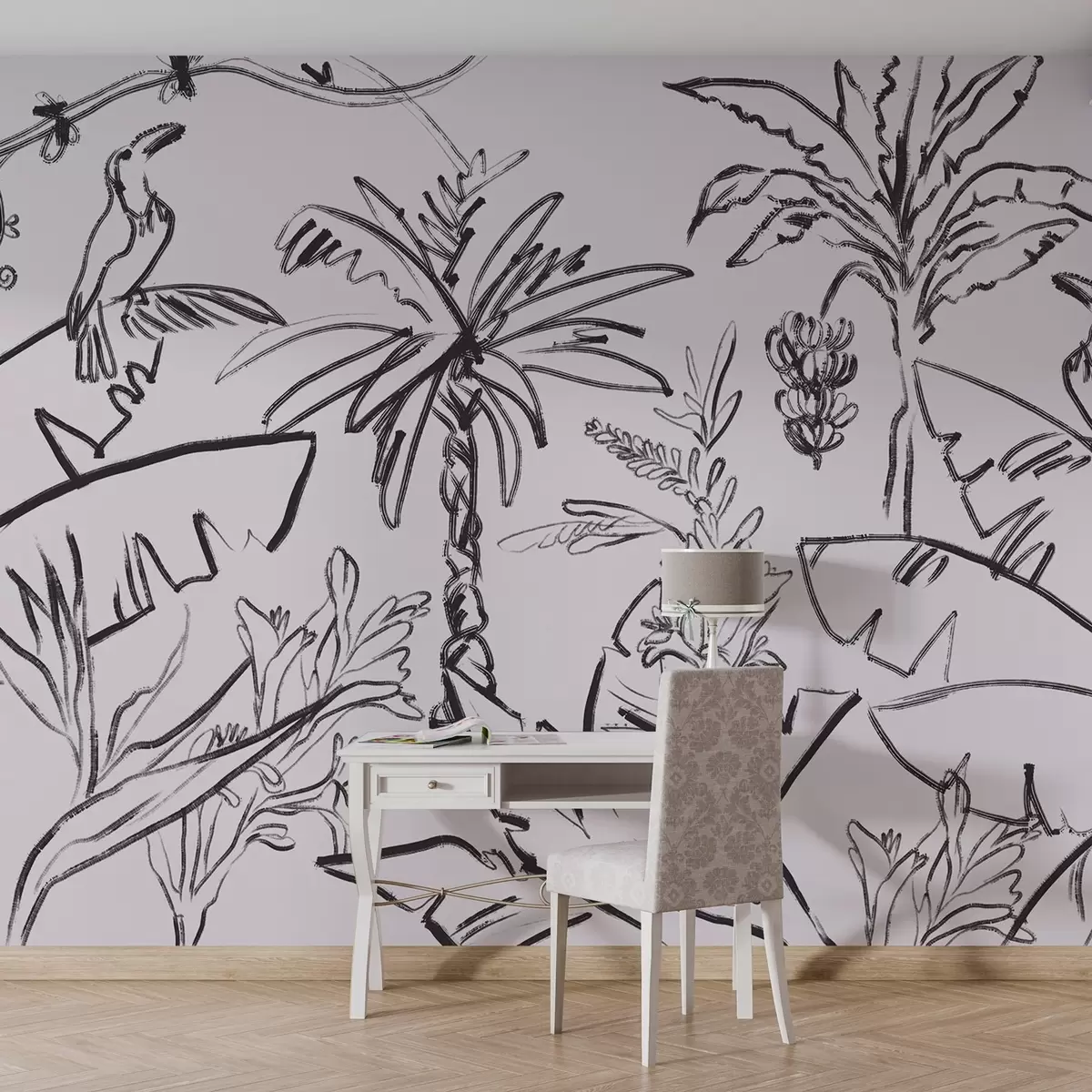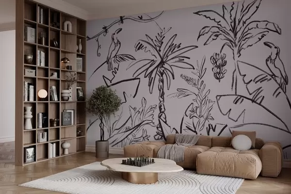 Fotomurales Motivo tropical en color negro, palmeras, plátanos, contorno gráfico Nr. w04020v7