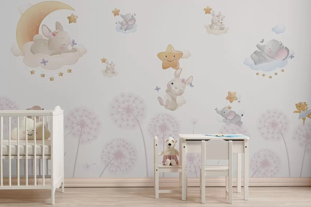 Fotomurales Lindo conejo y estrellas entre dientes de león sobre fondo blanco Nr. w04195