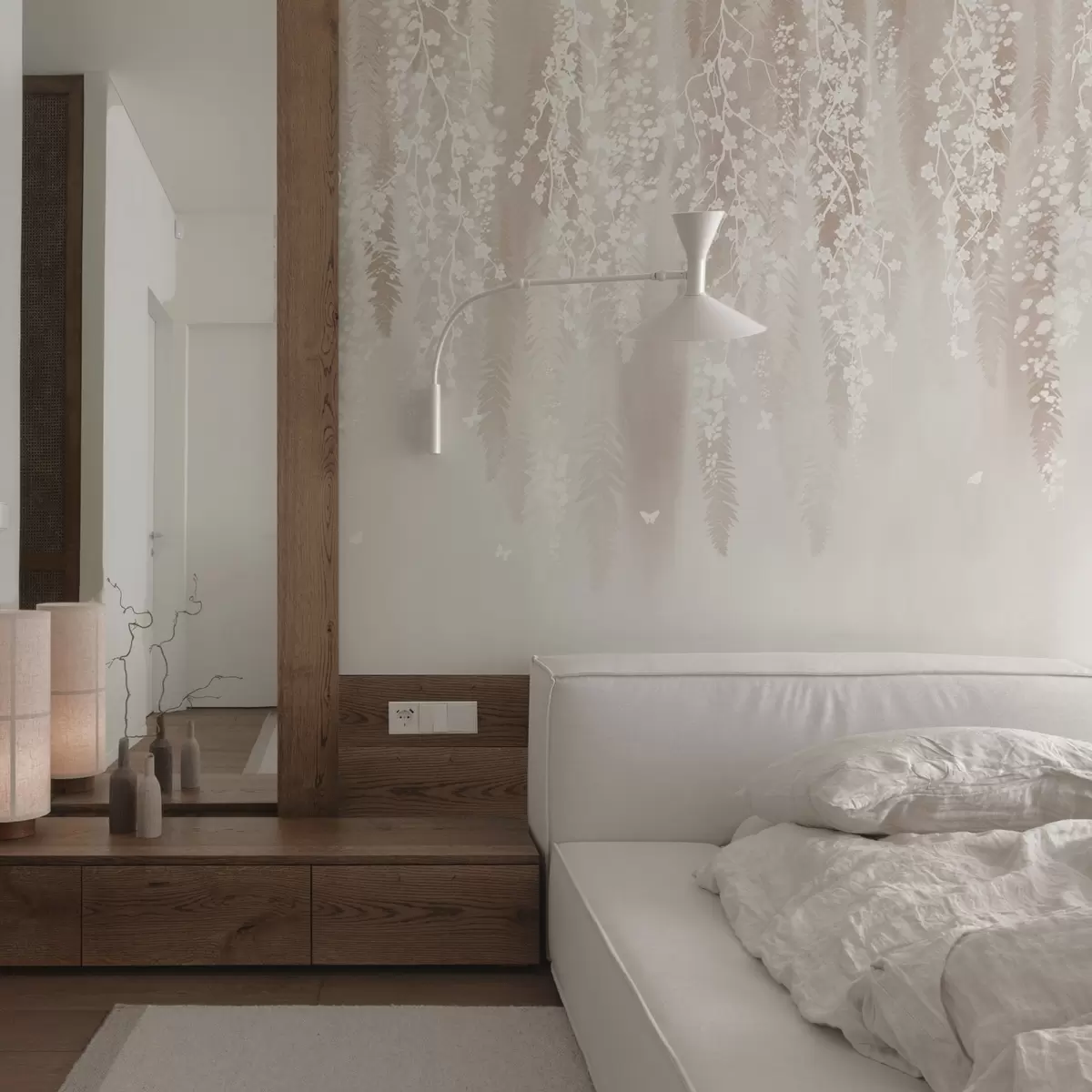 Fotomurales Ramas ligeras con flores blancas sobre un fondo suave Nr. w04417
