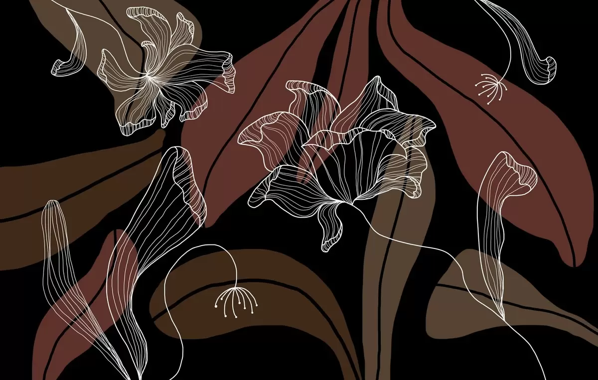 Fotomurales hojas y flores abstractas en tonos empolvados y beige sobre un fondo oscuro Nr. w04499v3