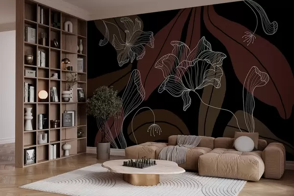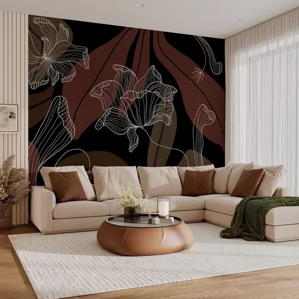 Fotomurales hojas y flores abstractas en tonos empolvados y beige sobre un fondo oscuro Nr. w04499v3