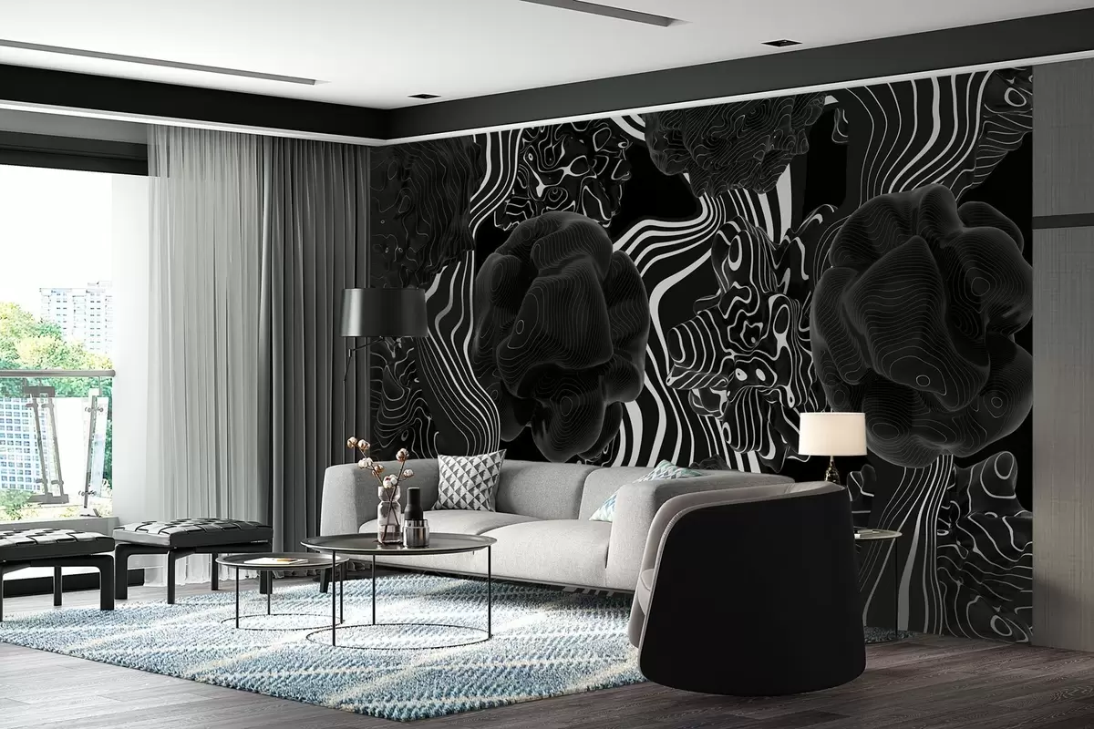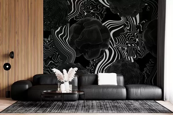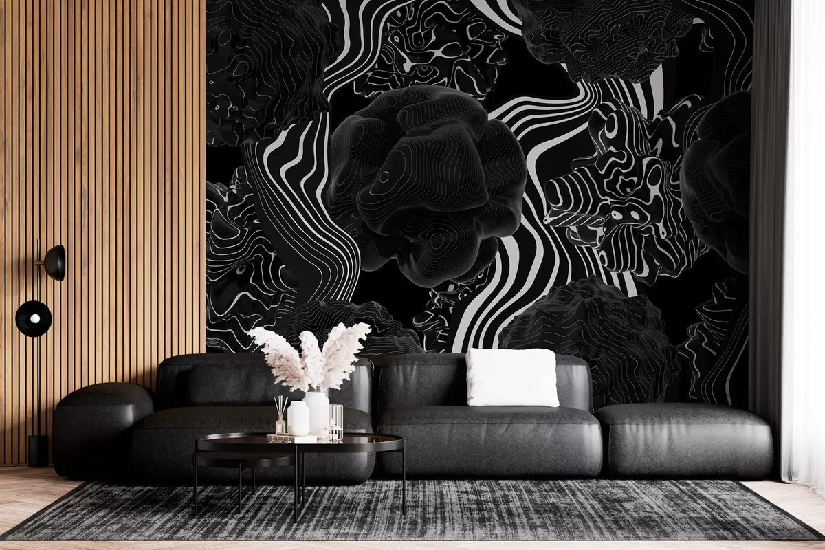 Fotomurales formas orgánicas abstractas en estilo 3D en tonos negros con rayas blancas Nr. w04628