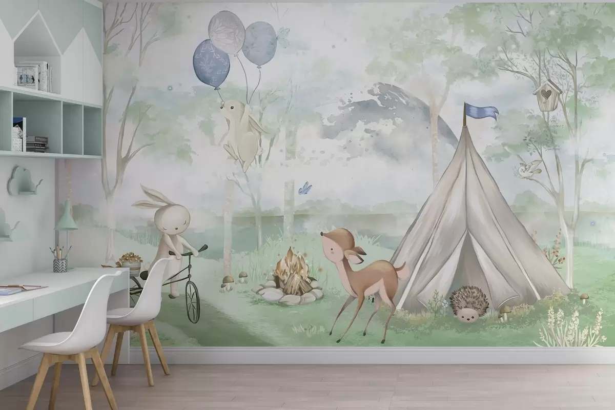 Fotomurales Campamento infantil en el bosque: conejitos, cervatillos, tienda de campaña y hoguera Nr. w04671v1