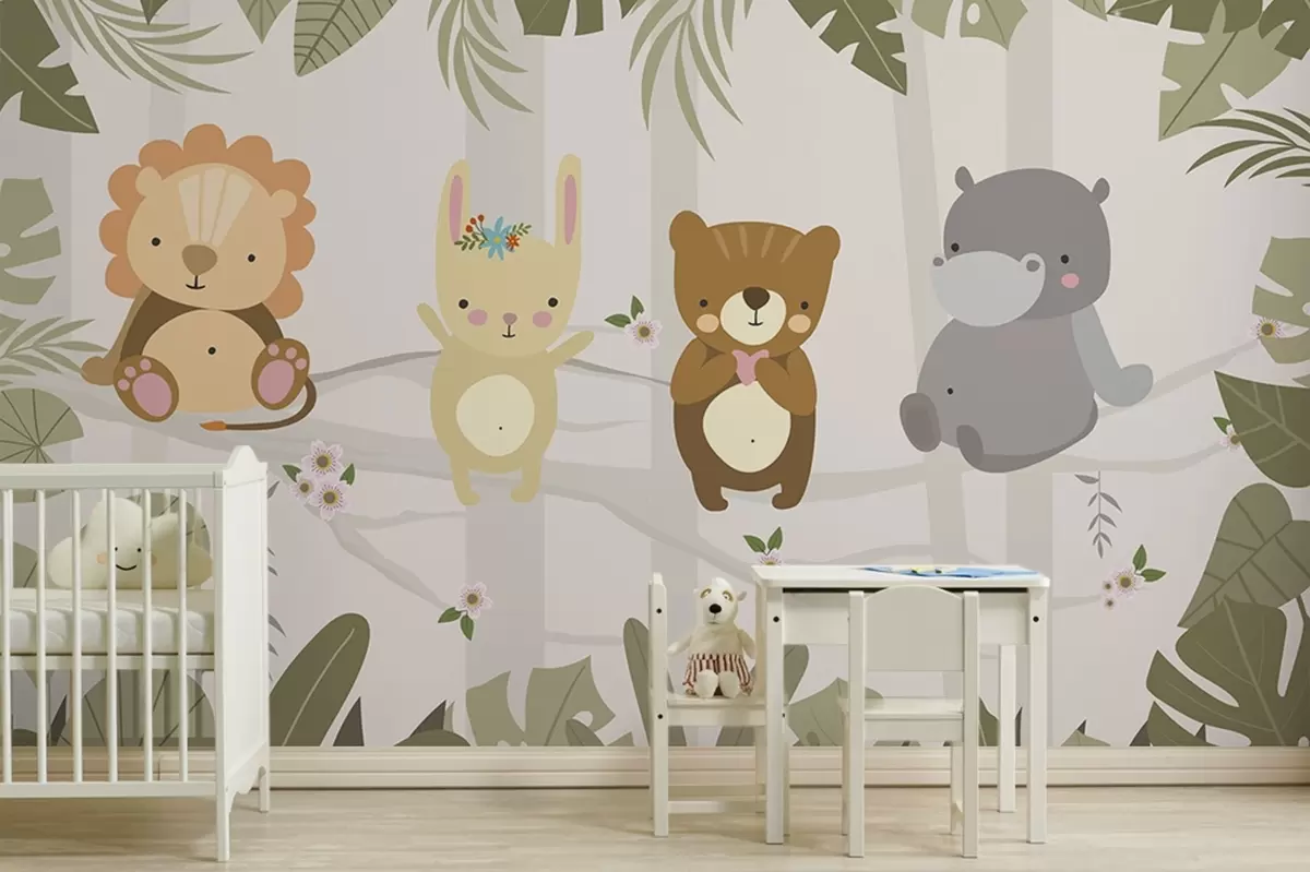 Fotomurales Lindo león, conejo, oso e hipopótamo entre las hojas Nr. w04682