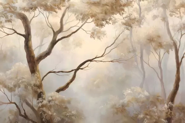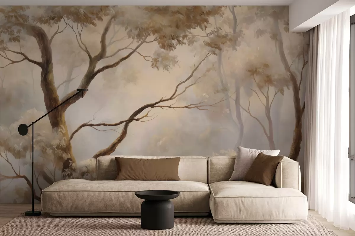 Fotomurales El bosque envuelto en la ligera niebla matinal. Una delicada pintura atmosférica al estilo de un paisaje artístico. Nr. w04817