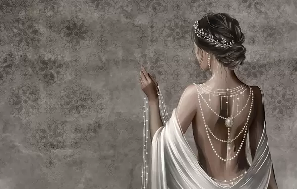 Fotomurales Mujer vista desde atrás con perlas, fondo con patrón de piedras grises Nr. w04854