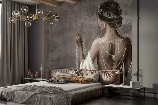 Fotomurales Mujer vista desde atrás con perlas, fondo con patrón de piedras grises Nr. w04854