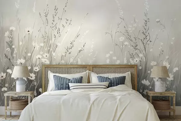 Fotomurales Suave escena de pradera con flores blancas y delicadas hierbas. Nr. w05015v1
