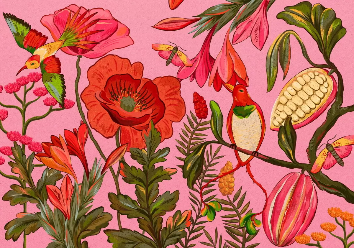 Fotomurales Flores y pájaros decorativos sobre fondo rosa Nr. w05036v2