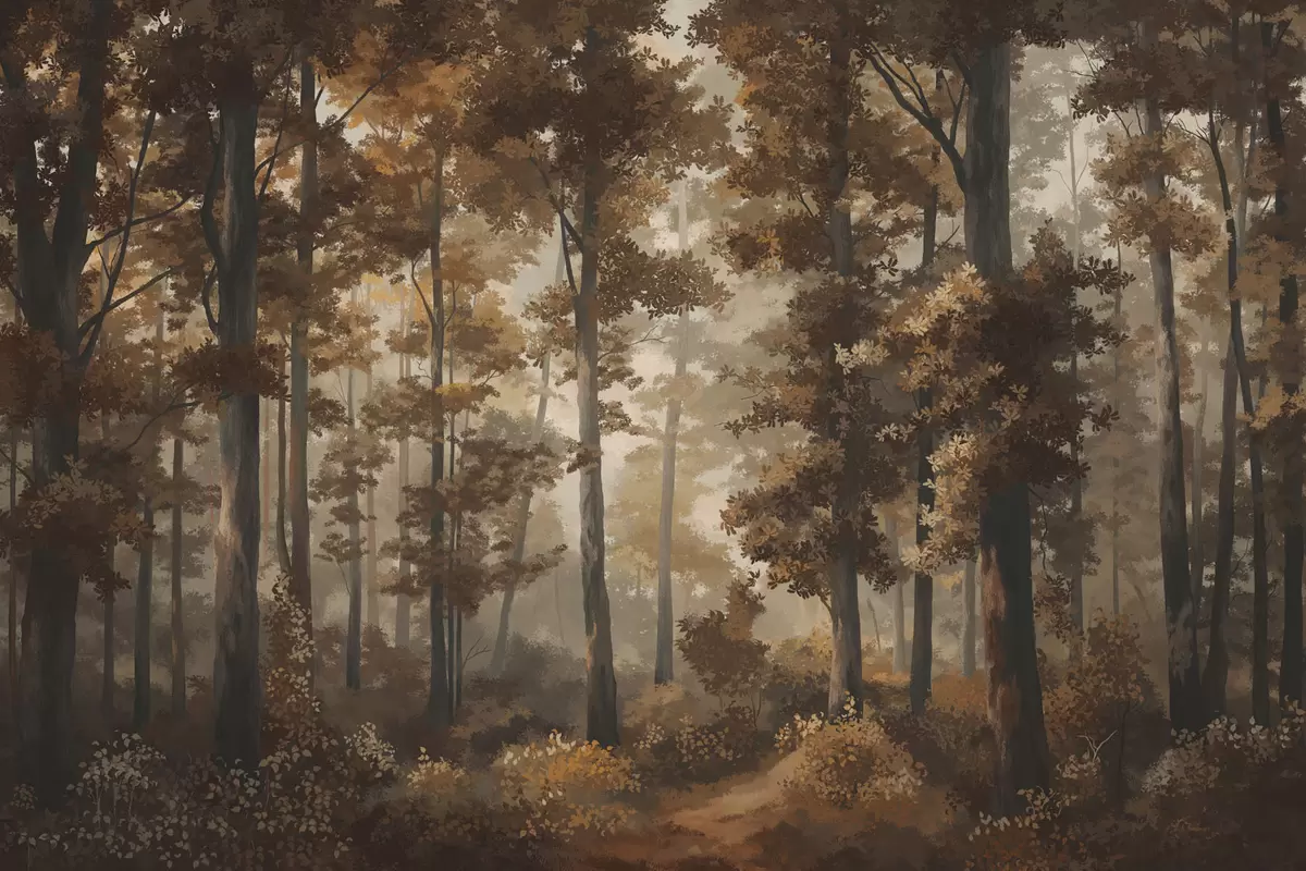 Fotomurales Escena otoñal en el bosque con luz cálida y árboles densos. Nr. w05089v1