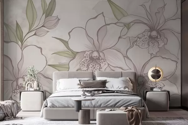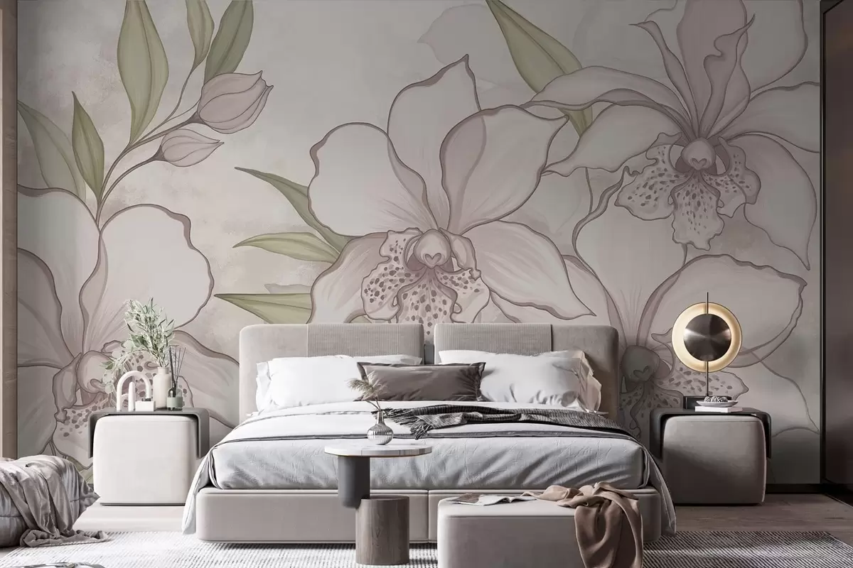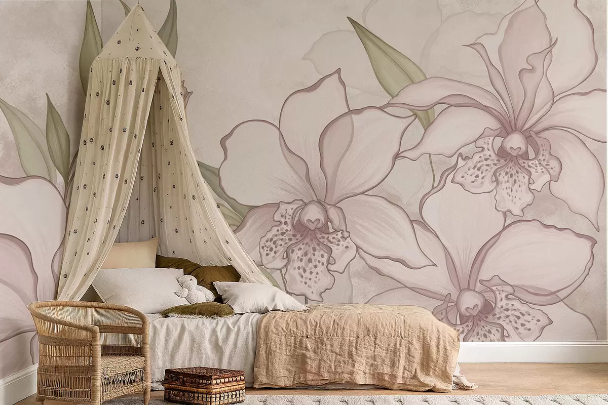Fotomurales Ilustración de orquídeas pálidas con hojas sobre fondo beige. Nr. w05117