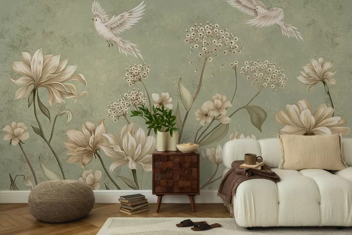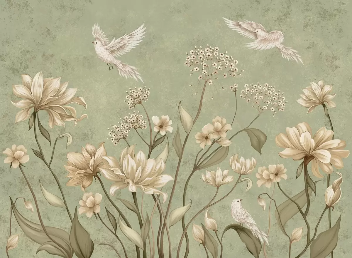 Fotomurales Flores y pájaros sobre un fondo verde con textura Nr. w05118v1