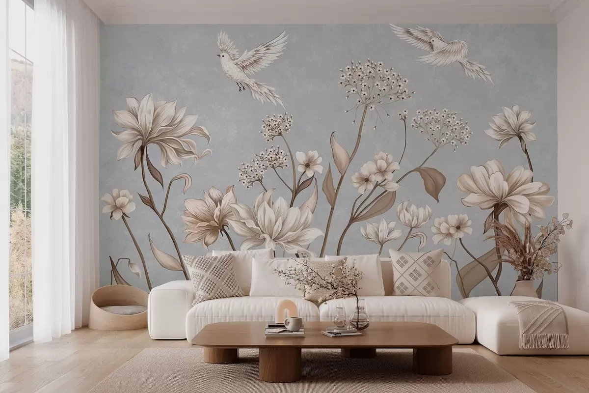 Fotomurales Flores y pájaros sobre un fondo gris azulado Nr. w05118v2