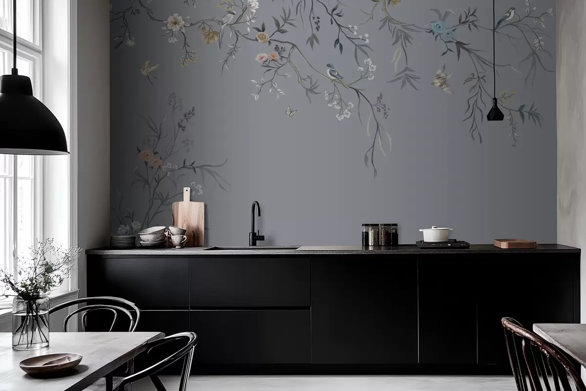 Fotomurales Ramas florales con pájaros sobre fondo verdoso Nr. w05127v5