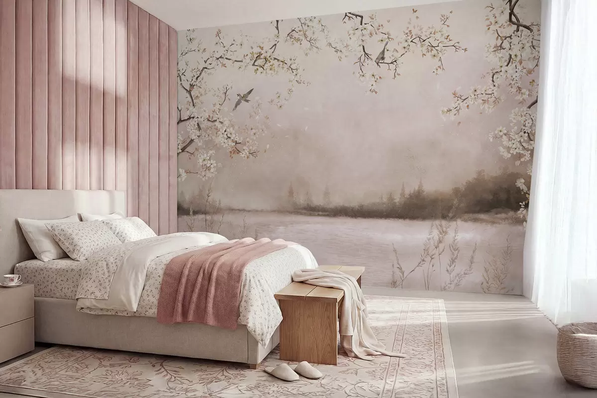 Fotomurales Ramas en flor sobre un lago tranquilo con pájaros en la niebla. Nr. w05155v1
